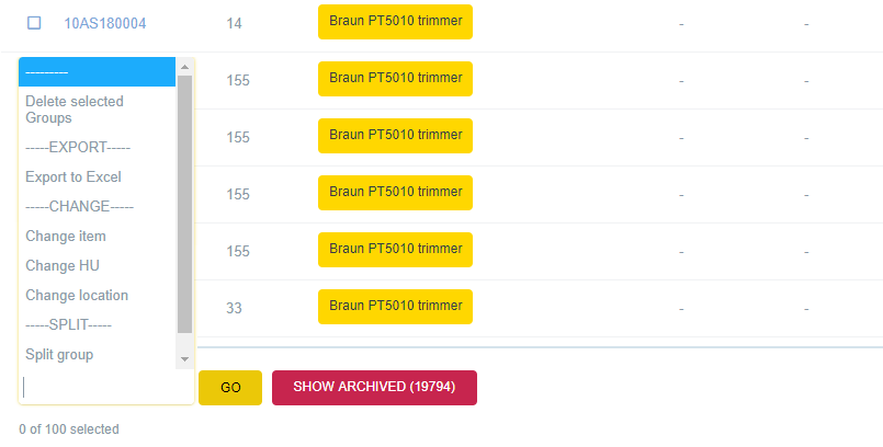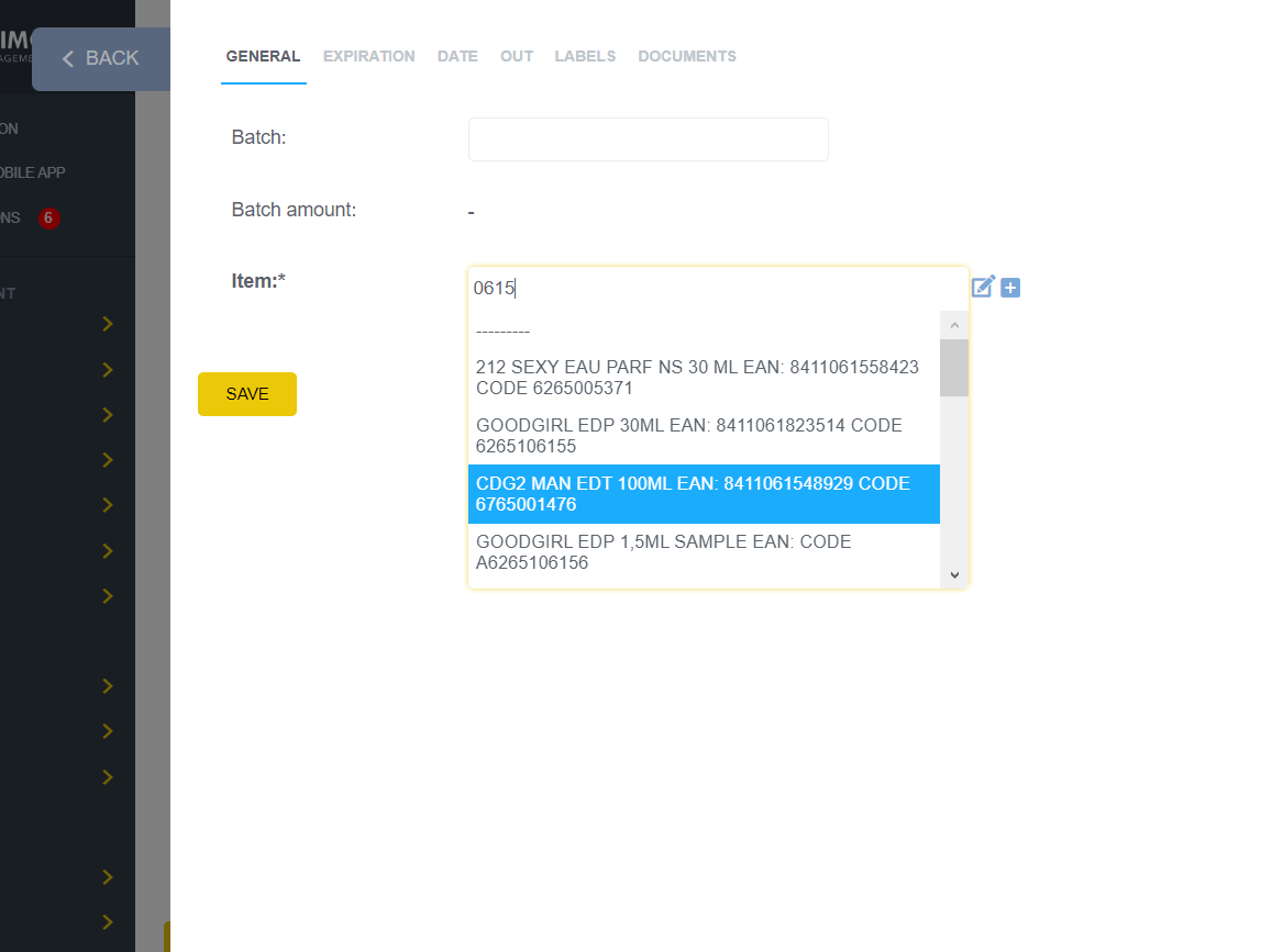 V kartě šarže je povinné vyplnit pouze ITEM = skladová karta produktu. Poté klikněte na [save]. Vrátíte se zpět do karty Groupy