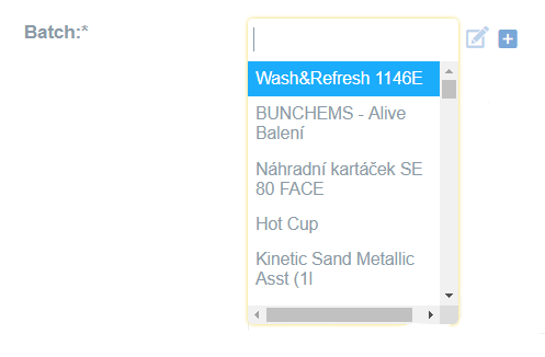 Pro přiřazení groupy k produktu je nutné jít přes šarže - pokud konkrétní šarže, lze ji najít dle názvu - pro založení je nutné kliknout na [+] vedle políčka