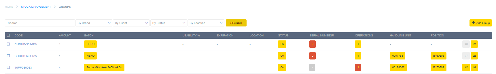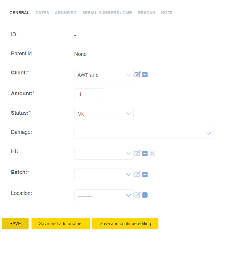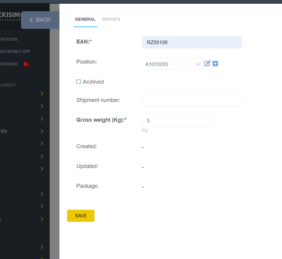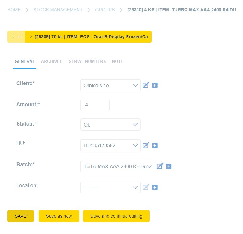 V kartě HU je povinné vyplnit pouze číslo HU a doporučené vyplnit pozici na které se produkt nachází. [save]. Vrátíte se zpět do karty Groupy