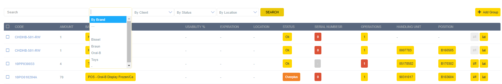 Dále lze vyhledávat pomocí rozbalovacích nabídek („By Brand, By Client, By Status, By Location“).