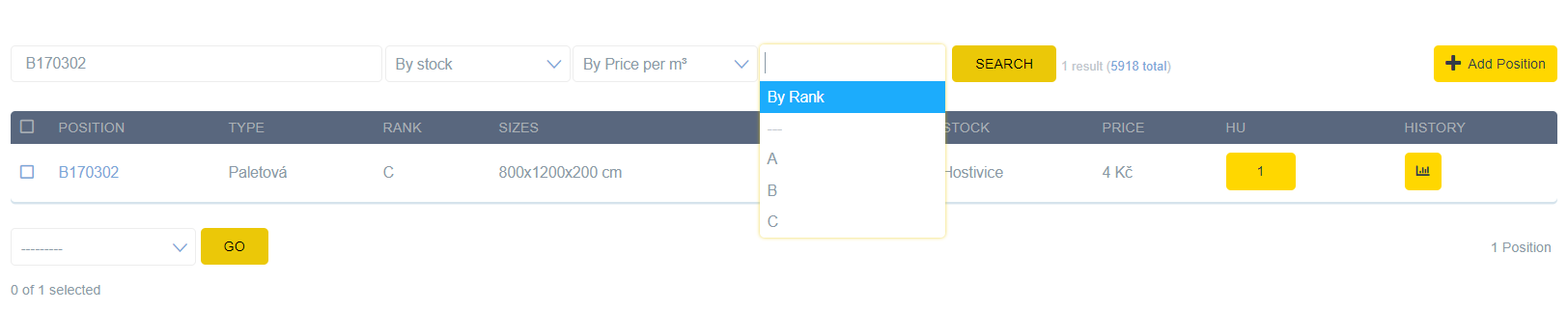 Dále lze řadit pomocí rozbalovacích nabídek: By stock a By price per m^3. Princip je u všech stejný. Lze také filtry kombinovat.