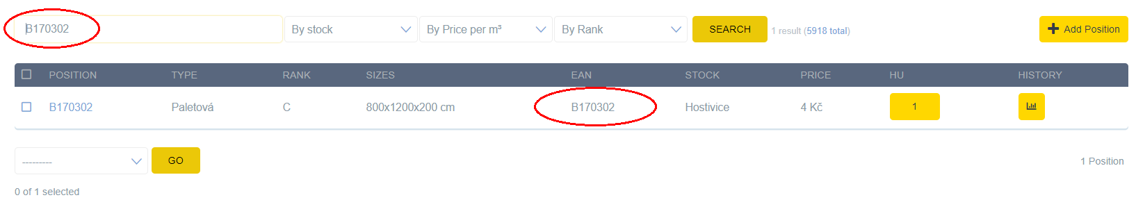 Po kliknutí na tlačítko search nám stránka vyfiltrovala pozice podle EAN B170302 a nalezlo nám to jeden item.