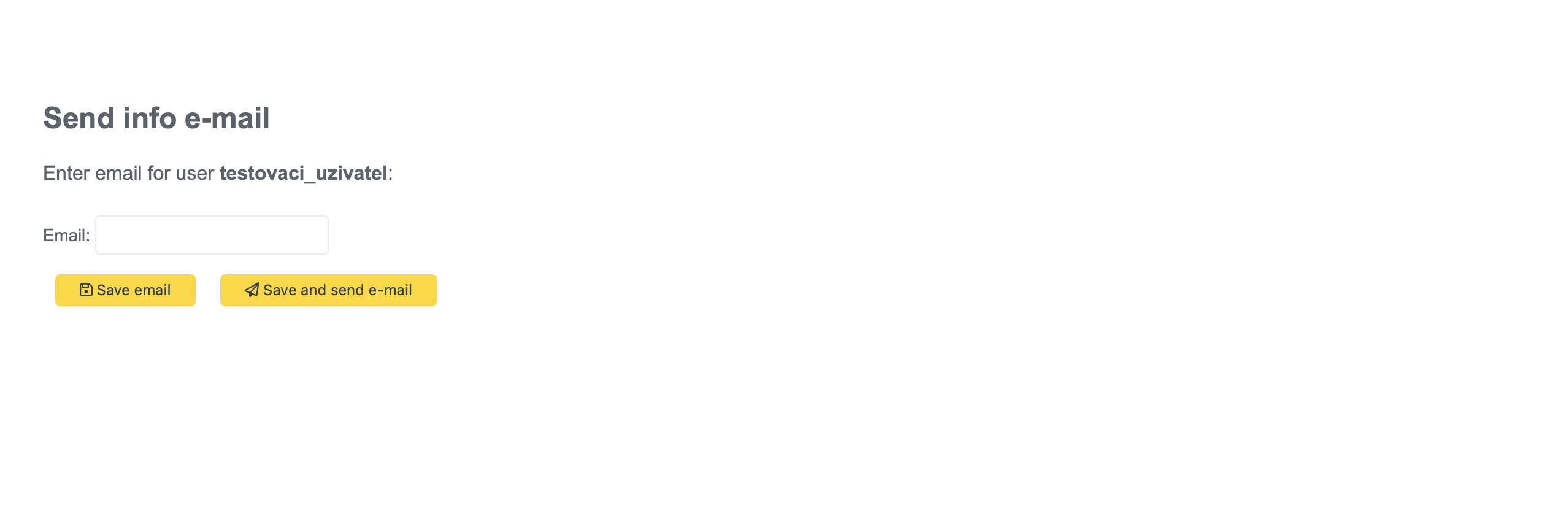 Po zadání přihlašovacích údajů a jejich uložení budete přesměrováni na formulář, kde je potřeba vyplnit e-mailovou adresu. Tento e-mail bude následně uložen k vašemu účtu. Na závěr si můžete vybrat, zda chcete odeslat informační e-mail, nebo pouze uložit zadanou e-mailovou adresu.